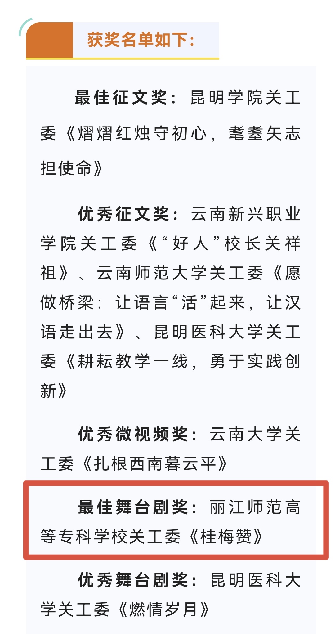 学校关工委按照云南省教育厅关工委的安排部署,积极动员,认真组织。最终,报送的作品《桂梅赞》获最佳舞台剧奖,学校关工委受到教育部关工委表扬。