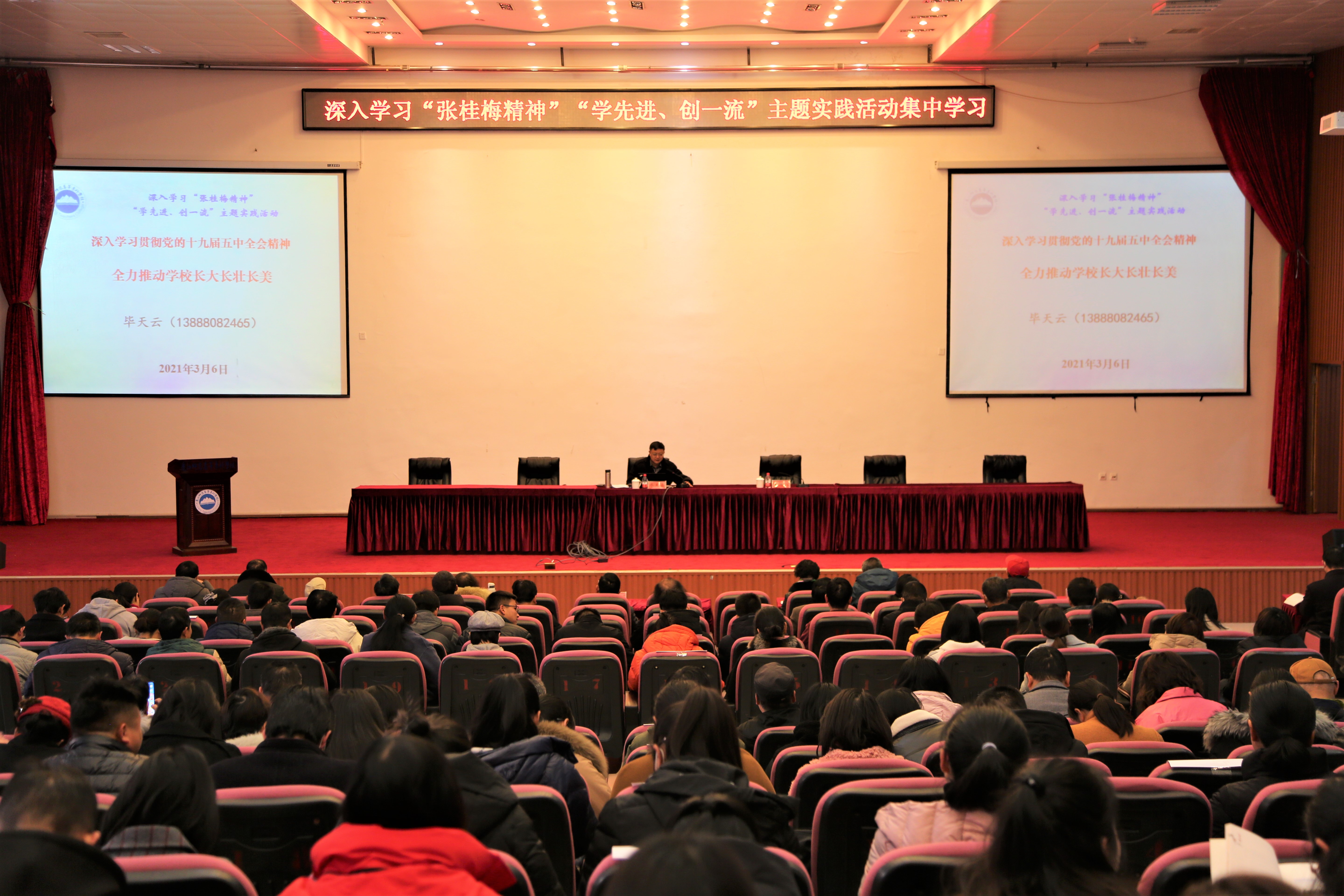 3月6日上午,毕天云校长为全校教职工作了题为“深入学习贯彻党的十九届五中全会精神 全力推动学校长大长壮长美”辅导讲座。围绕宣讲主题,他从三方面分享学习心得:一是全面理解党的十九届五中全会精神。他重点阐述了党的十九届五中全会精神总体情况、重大成果两方面内容,引领全校教职工深入理解党的十九届五中全会精神。他强调了建设高质量教育体系的重要性,强调了《中共中央关于制定国民经济和社会发展第十四个五年规划和二0三五年远景目标的建议》中的“三新一高”及重大意义。二是科学谋划学校的“十四五”发展蓝图。基于对十九届五中全会精神的理解,结合学校新发展阶段,阐述了学校发展阶段、发展定位、发展目标、发展思路、重点任务和改革举措。他反复强调了四校组团对口支援对学校发展具有划时代的意义,明确提出当前学校发展的主要矛盾——广大师生升本愿望强烈与短板弱项突出之间的矛盾。三是继往开来推进学校实现高质量发展。围绕学校2021年12项重点任务,他向全体教职工提出2021年筑牢命运共同体、凝心聚力谋发展、攻坚克难开新局、主动担当勤作为等工作要求。