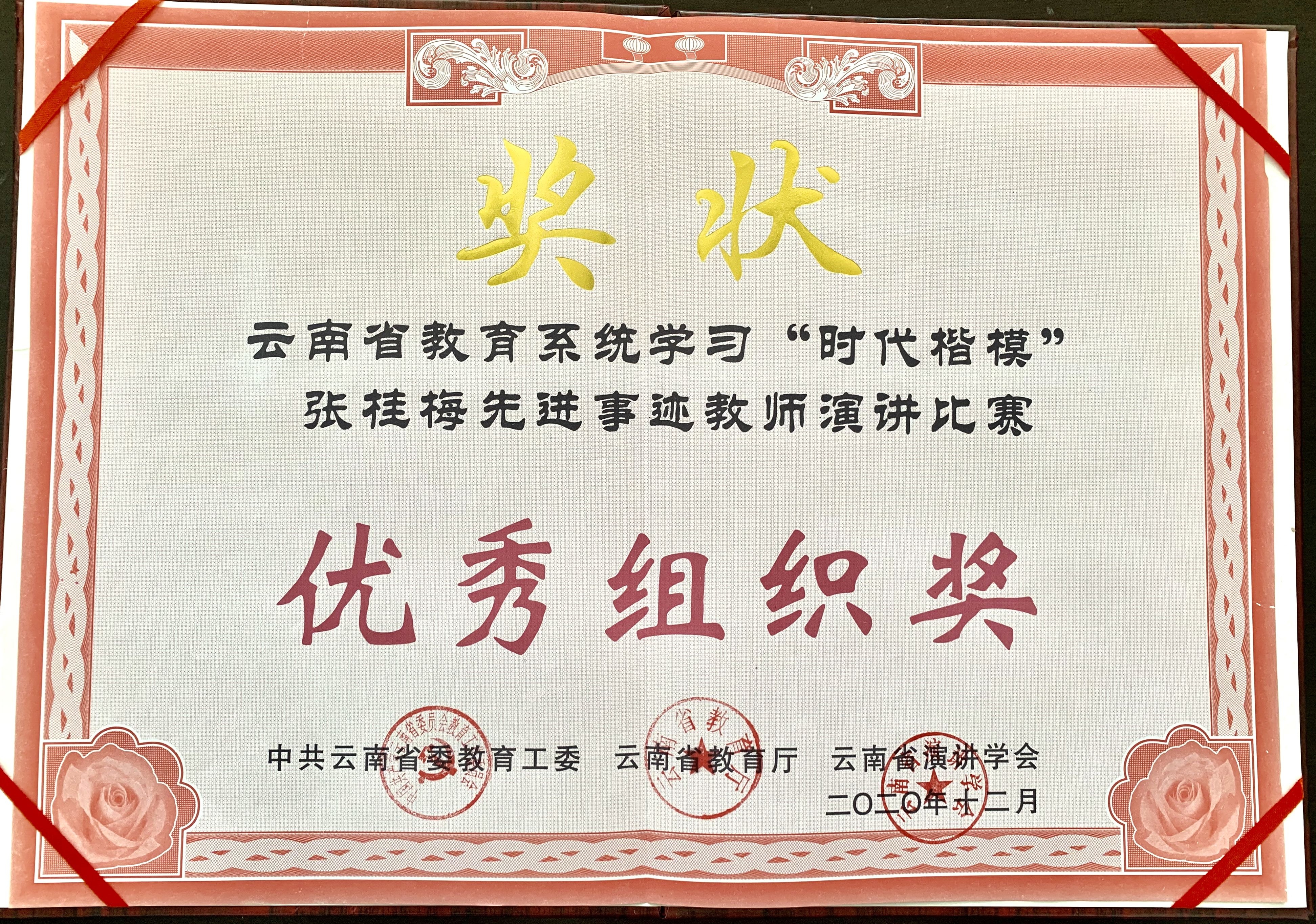 近日,由中共云南省委教育工委、云南省教育厅主办,云南省演讲学会、国家教育行政学院承办的云南省教育系统学习“时代楷模”张桂梅先进事迹教师演讲比赛决赛在云南省教育厅举行。我校荣获优秀组织奖,教师代表杨阳获三等奖。